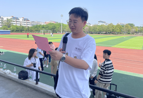 研究生辅导员张萌萌致辞,他指出本次活动的目的是激发同学们的拼搏精神,丰富同学们的校园生活,希望同学们发扬友谊第一、比赛第二的风格,赛出友谊。