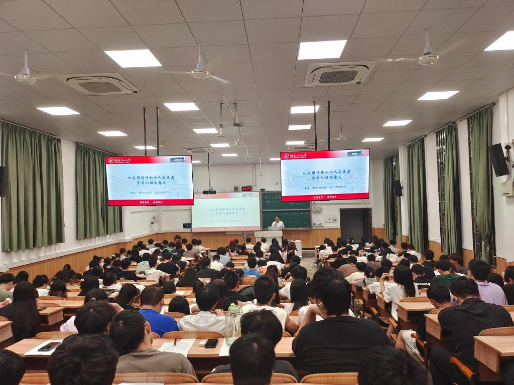 宣讲会上,黄海从参军入伍是“家国情怀”的感召力量、个人发展的优先选择及新时代国防建设的需要三个方面向与会同学们强调了其重大意义。他结合王阳明、曾国藩、左宗棠、蒋百里、梁思礼等历史名人的事迹,阐述了参军入伍不仅是个人成长的优选途径,更是担当社会责任、传承家国情怀的具体体现。他强调,作为新时代的青年学子,应当具备强烈的国防意识和历史使命感,勇于担当,敢于奉献,以实际行动践行爱国主义精神。最后,黄海向同学们介绍了征兵入伍的报名方式和相关政策,鼓励同学们积极响应国家号召,投身国防事业,为国防和军队现代化建设贡献青春力量。