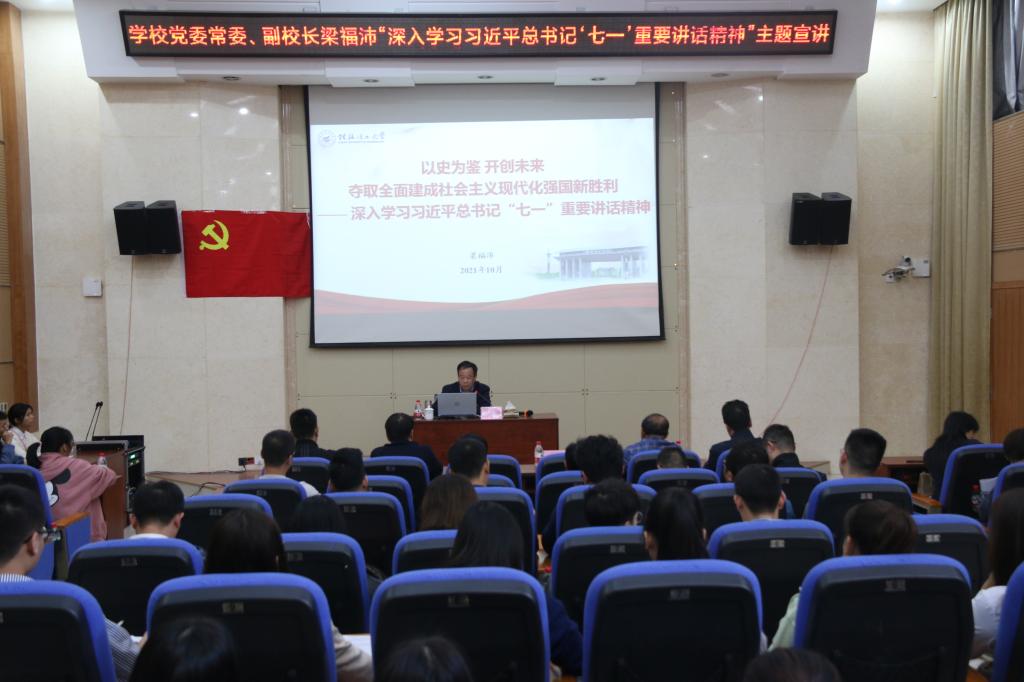 宣讲会上,梁福沛副校长以习近平总书记在庆祝中国共产党成立100周年大会上的重要讲话精神为切入点,分别从“深入把握习近平总书记‘七一’重要讲话精神的新思想、新观点、新要求”“深入把握中国共产党百年奋斗主题和伟大成就”“深入把握全面建成社会主义现代化强国的根本要求”和“深入贯彻习近平总书记‘七一’重要讲话精神”四个方面进行宣讲。首先,梁副校长讲解了为什么习近平总书记“七一”重要讲话是闪耀着马克思主义真理光芒的纲领性文献,为什么这篇重要讲话是能够激励全党全国各族人民同心同德、满怀豪情地向全面建成社会主义现代化强国进军的动员令和行动指南。随后,梁副校长回顾中国共产党百年的奋斗和伟大的成就,讲述了中国共产党如何带领中华民族走向伟大的复兴之路,深入阐释了全面建成社会主义现代化强国的根本要求。最后,梁副校长呼吁广大青年在新时代中,要坚定崇高的理想信念,坚持党的全面领导,同时要在学习中增长知识、在工作中增长才干,苦练本领,为成为全面建设社会主义现代化国家的先锋和栋梁而不断前进。