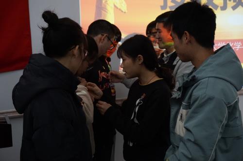 会议伊始,由陈楠同志宣读大会议程并宣布大会开始。首先由四名发展对象分别上台陈述自己的入党动机、对党的认识以及向党组织汇报自己成为入党积极分子以来工作、学习、思想、生活上的转变。接着入党介绍人分别阐述发展对象的基本情况,并对其能否加入党组织表明态度,支委会向大会汇报发展对象的政治审查报告。随后支部党员指出四名发展对象存在的问题并进行提问,对其有更深的了解。接着由支部正式党员进行不记名投票,赖廷民同志监票,郑秋杏同志计票,陈楠同志宣布大会决议,何丽、陈文俊、郑靖萱、杨帆四名发展对象全票通过成为中共预备党员。大会最后,何丽、陈文俊、郑靖萱、杨帆四名预备党员面对党旗庄严宣誓,由支部党员同志为他们佩戴党员徽章。