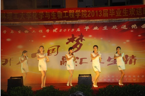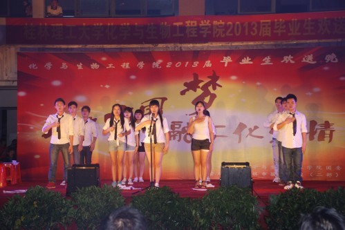 朝夕耕耘,图春华秋实;十年寒窗,求学有所用。似水流年,体味完美人生;分手再见,走向灿烂明天! 6月15日晚,以“开启中国梦,融汇化生情”为主题的化生学院2013届毕业生欢送晚会在雁山校区三栋广场隆重举行。化生学院党委胡祖生书记、院长李建平教授、党委陶剑飞副书记、副院长杨建文教授、院长助理海洪副教授与学院五百多名师生一同观看了晚会。
