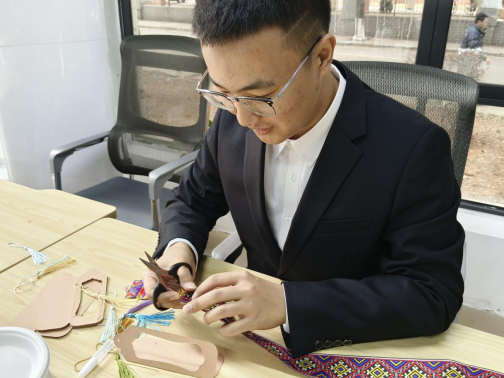 活动中,学院壮族优秀文化学习社负责人刘星昊同学带领大家进行了广西非遗文化探秘,重点为大家讲解了壮锦和铜鼓相关知识。壮锦,作为壮族传统手工织锦,以其精巧的工艺、华美的色彩和蕴含丰富寓意的图案,承载着壮族千年的历史文化记忆。铜鼓,以其独特的造型、精美的纹饰和深沉的音色,成为广西非遗文化中的一颗璀璨明珠。在社团成员们耐心地指导下,同学们纷纷动手,开启了一场充满创意与乐趣的手工制作之旅。同学们将现代设计理念与传统手工艺巧妙融合,每一个步骤都饱含着大家对传统文化的尊重与热爱,大家纷纷表示将积极投身于非遗文化的保护与传承中,为弘扬中华优秀传统文化贡献自己的力量。