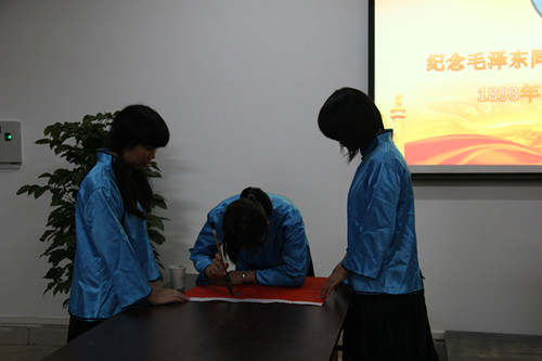 化工2014级卓越班的同学通过朗诵毛泽东同志的词——《沁园春·长沙》、来自校书法协会的同学通过现场书法表演向一代伟人毛泽东致敬,以大学生独特的方式纪念了毛泽东同志121周年诞辰。最后,活动在全场同学一起朗诵“三爱”主题诗的激昂声音中圆满落下帷幕。