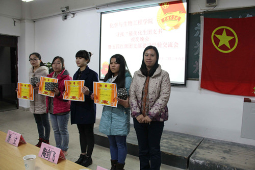 在励新楼206室举行寻找“最美化生团支书”活动颁奖晚会暨五四红旗团支部建设经验交流会,本次晚会是对过去两个月化生学院打造特色团支部活动的总结。出席本次活动的嘉宾有学院党委副书记陶剑飞、学院团委学生会主席团成员及各班班长、团支书。