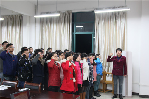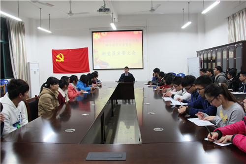 大会伊始,何宗辉老师就本次发展新党员中出现和存在的问题进行了总结,并提出了要求,他强调入党是一件严肃的事情,必须认真对待,端正自己的入党动机。紧接着由本科生第一支部任永刚同志带领全体预备党员面向党旗进行入党宣誓,宣誓过程庄严肃穆,铮铮誓词代表了他们对党的忠诚决心。