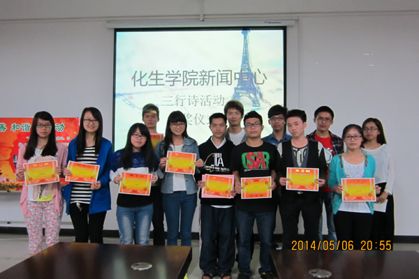 党委副书记陶剑飞老师、13级辅导员陈文甫老师出席了颁奖仪式。两位老师对 “三行诗”主题文化活动的效果和意义表示了充分的肯定,并祝贺了获奖的同学,希望同学们以后可以继续发挥自己的特长,创造出更多优秀的作品,丰富校园文化生活。其次,晚会对优秀的获奖作品进行了展示,诙谐幽默、情感真挚的作品风格真切的表现出了同学们的才华。接着,老师给获奖的同学颁发了奖状和奖品。最后,获奖的同学以及快看漫画的成员们分别拍照留念,在热烈的掌声中,整个活动圆满结束。