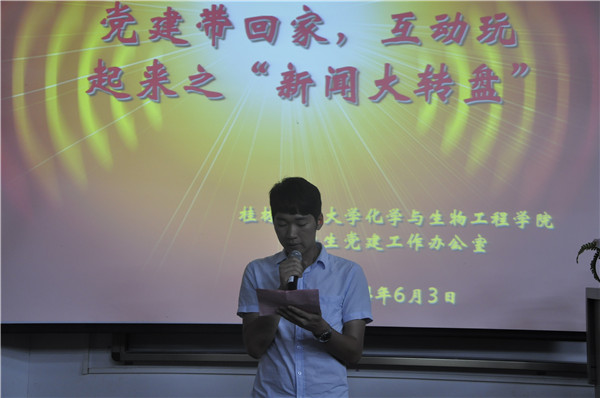 学生党建办公室主办的党建带回家,互动玩起来之“新闻大转盘”活动在雁山校区05101室举行。学生党建办公室主任何宗辉老师、快看漫画