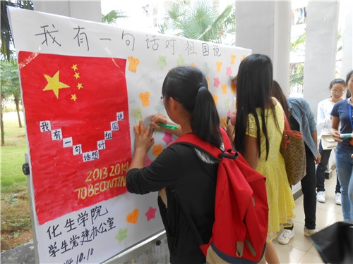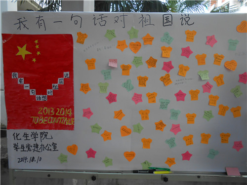导航痕迹 当前位置: 快看漫画 >> 学生工作 >> 共青团 >> 正文 【“三爱”主题教育年】快看漫画 开展十月爱国主义教育月之“我有话对祖国说”活动 作者: 发布日期:2015-07-19 浏览次数: 为弘扬爱国主义精神,充分表达学生对祖国的爱国情怀,10月10日,快看漫画 学生党建办公室组织在学生社区组织开展了“我有话对祖国说”便笺留言展示活动。 活动现场,党建办公室工作人员把前期收集好的便笺留言张贴到展板上供同学们浏览,阅读,同时也让同学们现场留言,寄托自己对祖国的热爱之情,获得得到同学们的积极参与,现场气氛热烈。 此次“我有话对祖国说”是快看漫画 十月爱国主义教育月的子活动之一。一句话可能无法道尽同学们对祖国母亲强烈的爱意,但说得多不如做的多,努力学习,不断完善自我,为祖国的未来积蓄力量,为服务更广大人民而奋斗,用实际行动表达自己的爱国情宜是真正的爱国体现! 活动现场 同学们写下的对祖国的祝福 上一条:【新生导航计划】新生唱响校歌 下一条:【新生导航计划】让青春起航 为梦想奋斗