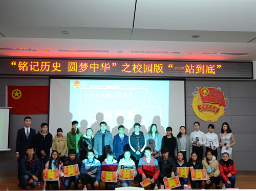 团委学生会承办的“铭记历史,圆梦中华”12月大型团日活动之校园版“一战到底”决赛在逸夫楼报告厅隆重举行。出席本次比赛的有化生学院13级辅导员陈文甫老师、校团委学生部办公室主任及各兄弟学院嘉宾。
