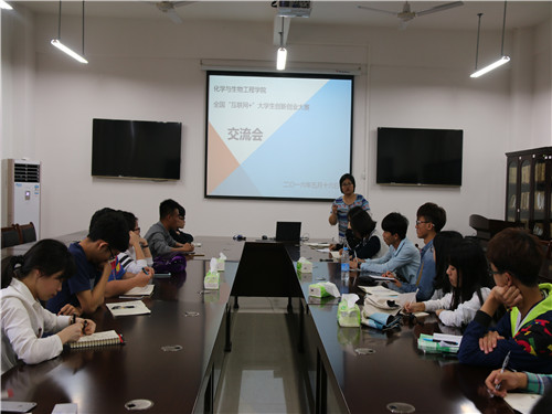 于雁山萃华楼217会议室组织召开全国“互联网+”大学生创新创业大赛交流会。出席会议的有学院团委书记饶筠筠老师、学院团委副书记苏蝶以及学院各参赛成员。