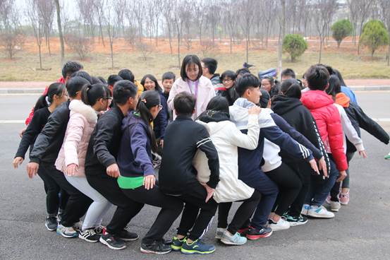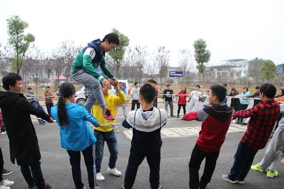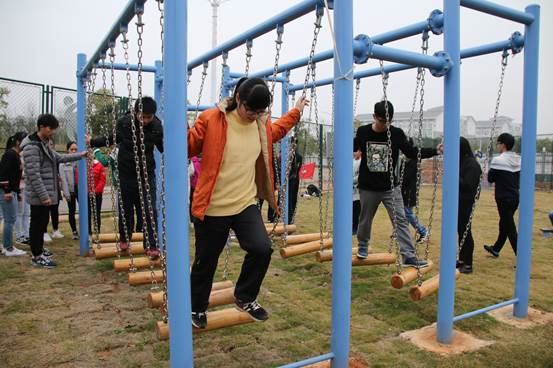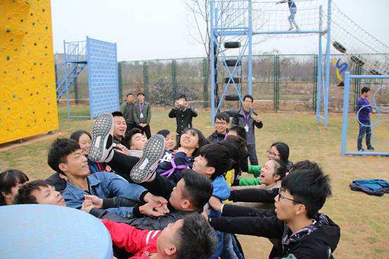 再者是“飞跃独木”,一个人依靠自己的能力爬上高处的独木桥,再从由轮胎和锁链构成的“梯子”下,挑战自己,战胜心理恐惧,增强勇气、胆识。“信任背摔”游戏,活动中有一名同学站在一人高的台子上背对着地面,其他同学则两两站在那名同学后面手搭手组成“人床”,然后那名同学从台子上直接躺在“人床”上。这个项目的意义在于考验团队间的信任感,个人的勇气和胆识,考验两个人之间的协调能力和平衡能力。