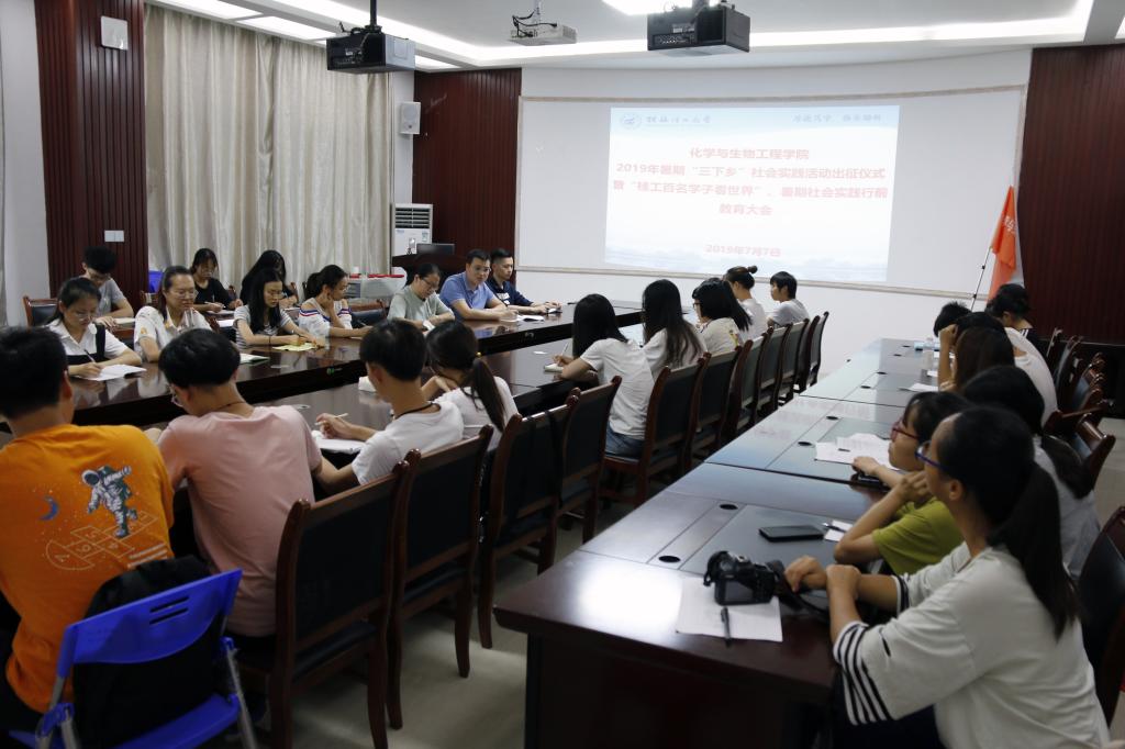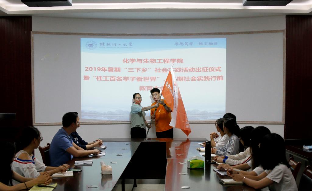 在12217会议室举办2019年暑期“三下乡”社会实践活动出征仪式暨“桂工百名学子看世界”、暑期社会实践行前教育大会。学院党委副书记江玲,学院团委副书记黄道坤、实践团队指导老师殷鸿达、熊艳以及看世界项目、社会实践团队全体学生参加了会议。