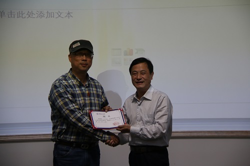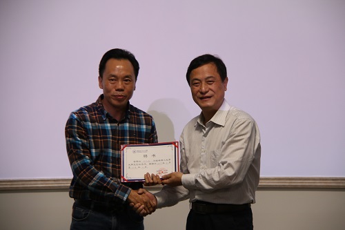 学校副厅级调研员张劲松为江门市君盛实业有限公司董事长、广东江门湖南商会执行会长江友飞颁发聘书