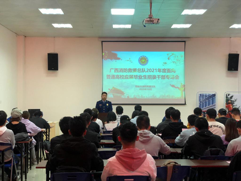 招聘宣讲会在雁山校区招聘宣讲室召开。会上,支队政委详细介绍了消防救援支队的基本情况及本次招聘的背景、目的、岗位需求及主要工作内容等,分析阐述了“消防”这一特殊职业对保护地方经济建设、国家公共财产及人民生命财产安全、维护社会稳定等方面的重要作用,并就“消防人”所必备的的责任心、奉献意识、担当精神等基本职业素养进行了重点强调。随后,通过交流互动,部分学生与支队达成了就业初步意向。