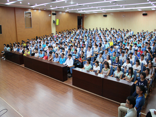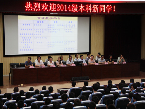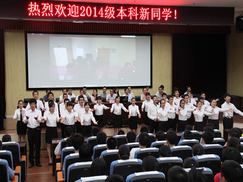 、学院历史、师资力量、教学与科研平台以及取得的成绩等方面作了详尽介绍。同时,李院长还对新生提出了几点希望,希望他们尽快转换角色,树立目标,适应大学生活。议程第二项,老生代表院学生会主席边晓寒同学发言,他从自己大一入学讲起,向新生介绍了丰富多彩,又充满挑战和机遇的大学生活,让新生队大学生活充满了向往。议程第三项,新生代表郭远强同学发言,他从自己入校的亲身感受谈起,勉励大家不忘自己十年寒窗苦读,珍惜大学生活,创造美好人生。议程第四项,教师代表李延伟老师发言,他向新生们讲述了自己的求学之路,勉励新生珍惜大学时光,练就扎实本领,攀登科学高峰。最后党委书记梁军作讲话,他首先对2014级新生的到来表示热烈的欢迎,随后他用诙谐幽默又充满激情的话语对新同学提出了几点要求,希望同学们格物致知,用不竭求索的精神刻苦学习;诚意正心,用奋发进取的拼搏砥砺品行;修身齐家,用不断提升的素质完善自我;治国平天下,用创新创造的能力担当重任。最后新生见面会在团委学生会合唱《相亲相爱一家人》温馨愉快的歌声中圆满结束。