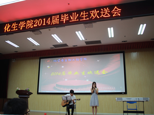 欢送会的第二阶段是节目表演,2013级同学的歌曲联唱和2011级同学原创歌曲演唱表达了对学长学姐的深深祝福;2012级同学的《化生快看漫画新闻