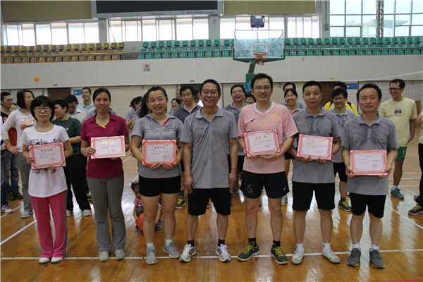 所属的各教研室、实验中心和两办(学工办、院办)人员分别组成的6支队伍参加,分淘汰赛和循环赛两个阶段进行,还特别规定了场上至少要有2名女运动员参赛。经过激烈角逐,最终决出了名次:应用化学教研室获得第一名,学工办和院办联合队、电化学教研室获并列第二名,实验中心、生物工程教研室、化学与化工教研室获得并列第三名。