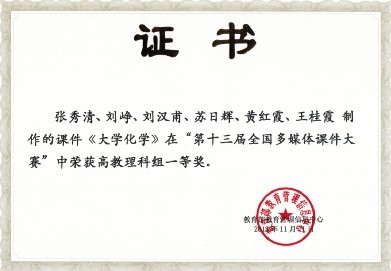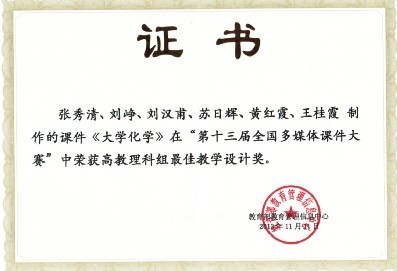张秀清、刘峥、黄红霞、王桂霞等老师制作的《大学化学》多媒体课件,经过初审、复审、决赛,从470件入围全国总决赛的作品中脱颖而出,荣获理科组一等奖和最佳教学设计奖。
