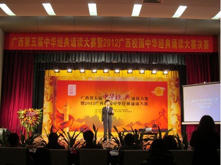 大学生良好的中国传统文化素养。广西第五届中华经典诵读大赛暨2012广西校园中华经典诵读大赛自今年4月份启动以来,全区各小学、中学、大学的师生及社会各界人士约30万人参与到活动中。经过学校初赛、赛区复赛共有110名选手进入总决赛,在中学生组、大学生组(专业组和非专业组)、中小学教师组、大学教师组(专业组和非专业组)、集体组、综合组等8个组别中激烈角逐。