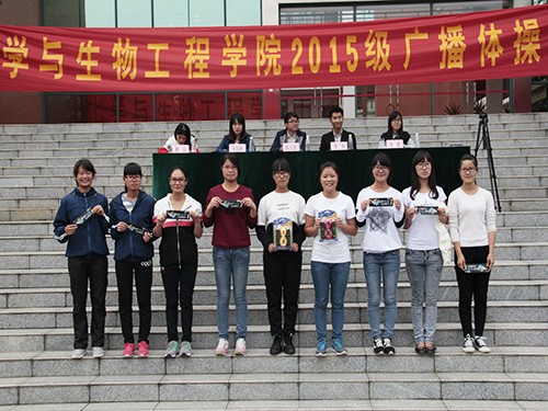 在紧张的统分工作进行期间,主持人随之展开了有趣的俯卧撑和跳绳互动游戏,同学们参与热情高涨,报名踊跃,场外的同学们大声地为本班的同学呐喊助威!在互动环节中,生工15-2班的男生包揽了俯卧撑比赛的一二名,跳绳比赛的桂冠则由15级卓越班的伍贤娟夺得。随着互动环节的结束,广播体操比赛最终也已确定:覃元俊,赵启迪,陈亚萍三名同学获得了“最佳领操员”的称号,化药15-3班获得三等奖,化药15-6班获得二等奖,化药15-2班以出色的表现获得本次比赛的一等奖。