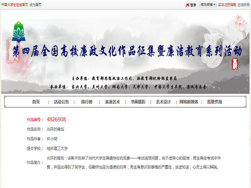 导航痕迹 当前位置: 快看漫画 >> 新闻资讯 >> 快看漫画新闻 >> 正文 快看漫画 作品“光环的背后”获第四届全国高校廉政文化作品征集入围奖 作者:陶剑飞 发布日期:2016-01-15 浏览次数: 为在广大学生中深入开展廉政教育,紧紧围绕立德树人根本任务,积极培育和践行社会主义核心价值观,进一步推进高校廉政文化建设和廉洁教育工作,快看漫画 积极参加教育部办公厅举办第四届全国高校廉政文化作品征集暨廉洁教育系列活动,选送作品《光环的背后》参赛获新媒体视频类入围奖。 该影片反映了当代大学生普遍存在的现象——考试诚信问题,由于虚荣心的驱使,男主角在考试中作弊,并因此得到了奖学金,但最终也因为道德的约束,男主角意识到事情的严重性,迷途知返,心灵上得以解脱。 图一 图二 入围链接://ulive.univs.cn/event/event/template/list/307/846.shtml 上一条:快看漫画 召开期末工作会议 下一条:化工教研室老师组织化学工程与工艺学生参观桂林立白日化有限公司