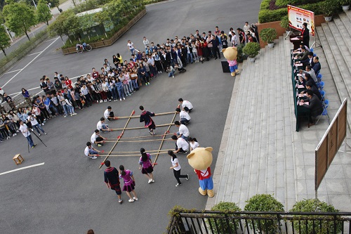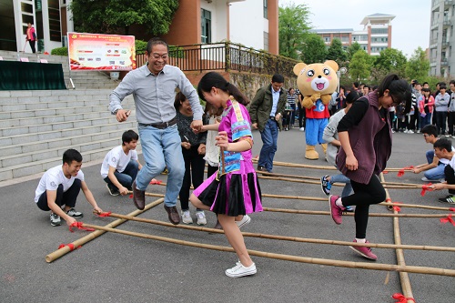 党委书记梁军宣布仪式启动,台上各位领导、老师将手中的绣球纷纷抛向在场同学们,紧接着壮族同学代表上台对山歌,歌声悠悠,传情达意;传统民俗“竹竿阵”更是将现场气氛拉到高潮,同学们纷纷跳起竹竿舞。最后,在两只易班熊的邀请下,各位领导、老师也一起加入竹竿舞的队伍中,体验着壮族文化的魅力。