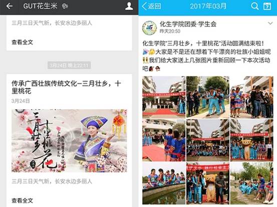 通过学院微信公众号“GUT花生米”、团委·学生会QQ官方账号、学院易班搭建线上宣传平台,进行广泛的宣传,打造“三月三”网上教育主阵地,营造良好节庆氛围。