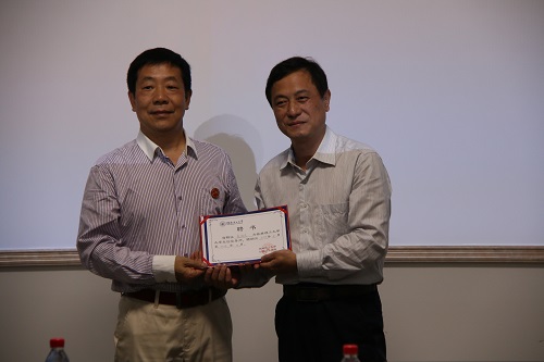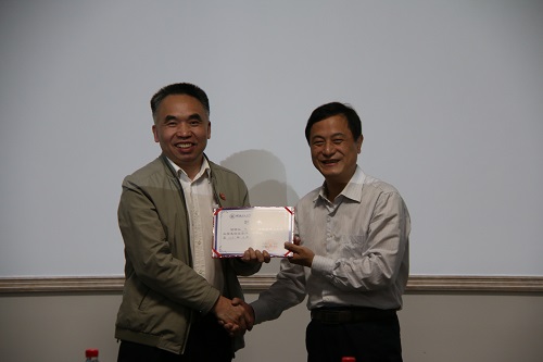 学校副厅级调研员张劲松为江门市君盛实业有限公司董事长、广东江门湖南商会执行会长江友飞颁发聘书