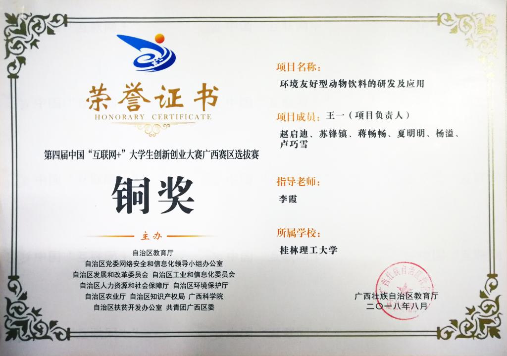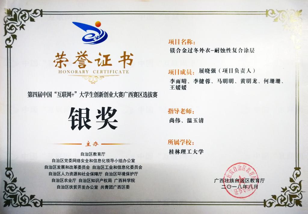 由尚伟、温玉清两位老师指导的“镁合金过冬外衣-耐蚀性复合涂层”项目获得银奖;由李霞老师指导的“环境友好型动物饮料的研发及应用”与潘宏程老师指导的“多项肿瘤标志物联合检测的液态芯片”项目荣获铜奖。