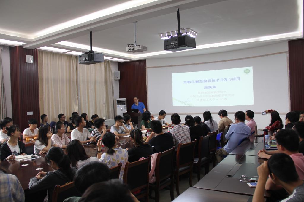 在报告中,周焕斌研究员介绍了基因编辑技术的发展及其应用现状。他详细讲解了其研究团队在水稻单碱基编辑技术方面的研究以及开发的多种基因编辑器等成果。在互动环节,周研究员对师生们提出的问题一一作了详细解答。