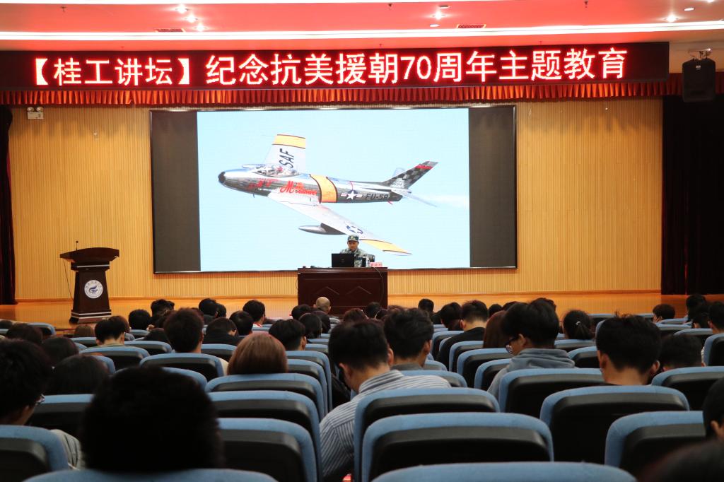 和公共管理与传媒学院承办的“纪念抗美援朝70周年”主题讲座在雁山校区图书馆报告厅举办。本次讲座特别邀请到袁晓刚师长讲述开国少将父亲袁彬 “抗美援朝”王牌空军的故事。学校团委书记李雨、学校团委副书记莫媛、各学院团委书记代表,学校第十期青马班学员和各学院团学青年骨干代表参加了本次讲座。
