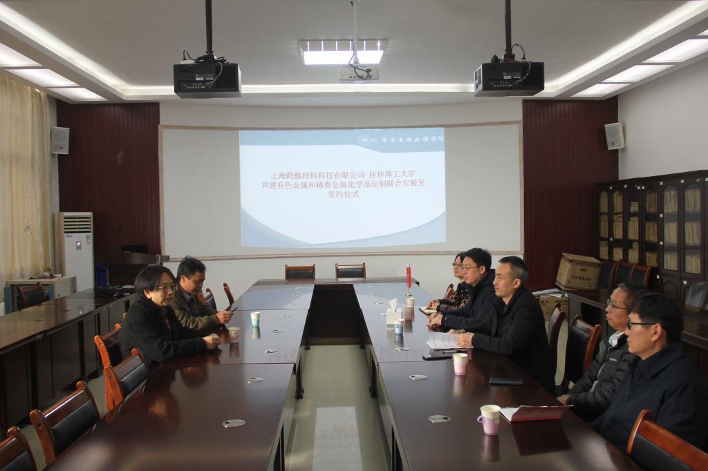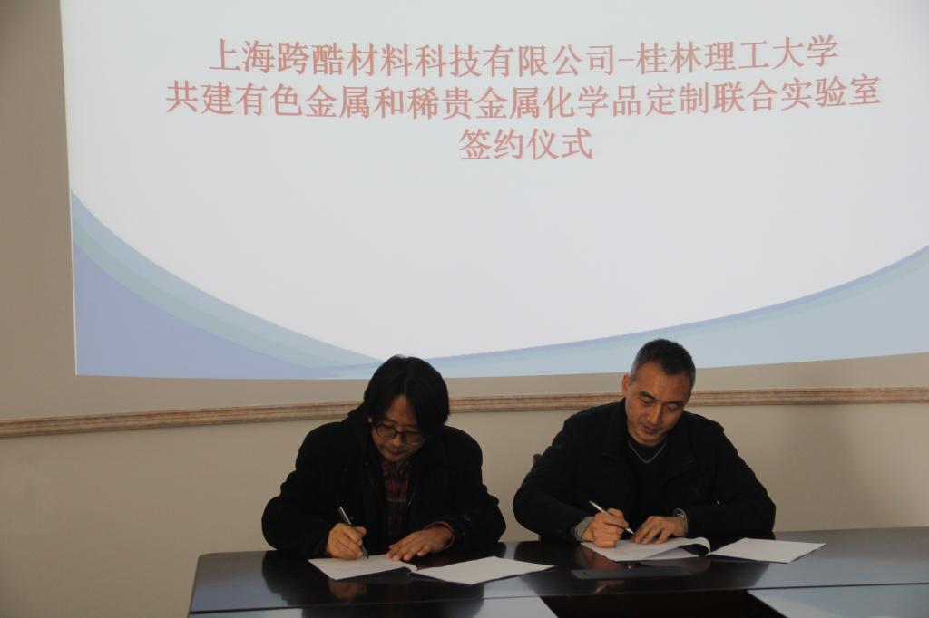 与上海跨酷材料科技有限公司(以下简称公司)在雁山校区12217多功能室举行签订共建有色金属和稀贵金属化学品定制联合实验室协议仪式。上海跨酷材料科技有限公司董事长王安之博士、快看漫画