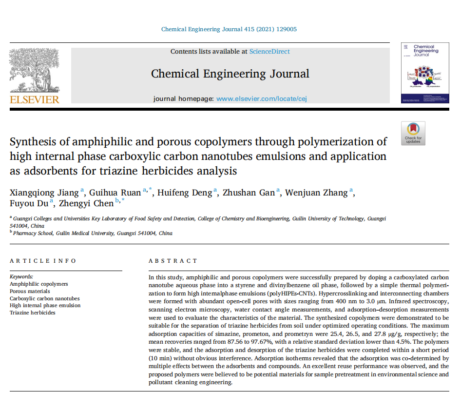 阮贵华研究员团队在多孔聚合物材料的制备及其应用研究传来好消息,其团队的研究成果——题为“Synthesis of amphiphilic and porous copolymers through polymerization of high internal phase carboxylic carbon nanotubes emulsions and application as adsorbents for triazine herbicides analysis”的论文被化学工程类国际知名期刊Chemical Engineering Journal(IF=10.652)录用并正式发表。