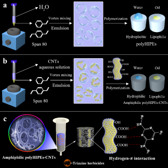 复杂基质中痕量物质的高效分离与富集一直是一个具有挑战的难题,在样品进行分析检测之前,样品前处理技术起着至关重要的作用。高内相乳液基多孔聚合物材料是一种由连续固相骨架以及孔洞组成的多孔材料,具有传质速度快、渗透率高、密度低、比表面积大等特点,在生命科学、药物分析、临床医学检测、环境科学等领域被广泛应用。然而,利用高内相乳液制备的多孔骨架材料存在刚性不够、疏水、易粉化的问题。该研究通过掺杂具有超强吸附力的少量碳纳米管(占材料质量的比重为1.75%),成功实现了材料的疏水性向两亲性的转变,该材料(polyHIPEs-CNTs)用于固相萃取技术的吸附剂,联合高效液相色谱技术成功用于土壤中三嗪农药的痕量检测并对polyHIPEs-CNTs对三嗪农药的吸附机理、吸附容量以及吸附动力学行为进行了系统性的研究。该研究为发展新型固相萃取材料提供了一种可行的思路与解决方案。