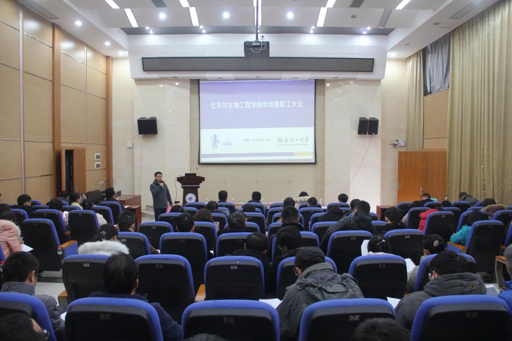 在雁山校区12号楼负一楼学术报告厅召开年终全院教工会议,学院全体教工参加。本次会议由学院院长匡小军主持。