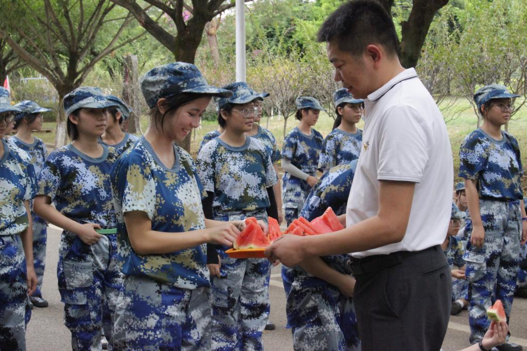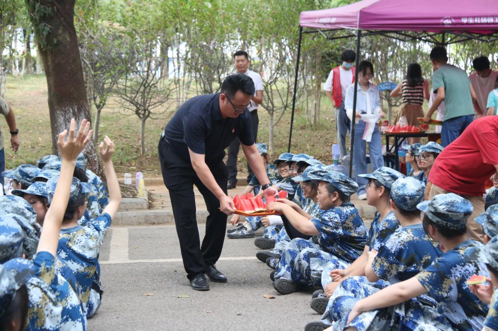 现场,彭书记一行向同学们分发清凉西瓜解暑,传递对新生的浓浓关心与祝福。参训学生备受鼓舞、士气高涨,并报以热烈掌声。大家纷纷表示将继续保持优良作风,磨炼意志,勤奋训练,彰显青春风采。