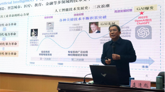 报告会上,李清彪教授以其深厚的学术造诣和前沿视野,深入剖析了生成式人工智能的崛起背景、演进脉络、应用领域及研究趋势。报告结合国内外高校调研数据、实际案例,使参会人员对生成式AI与高校人才培养、科学研究的关系有了更加全面深入的认识和思考。他指出,在生成式AI热潮下,人才培养和科学研究都需要与时俱进,教育工作者需要不断更新自己的知识体系,掌握最新的教育技术和方法,培养学生的批判性思维和创新能力,以适应新技术带来的挑战和机遇。