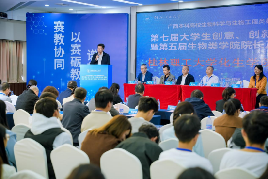 在化学及相关学科建设方面的进展。李有志代表广西本科高校生物科学与生物工程类教学指导委员会讲话,勉励参赛同学以赛促学,学研互动,以研兴学,展现新时代化生学子的专业风采。