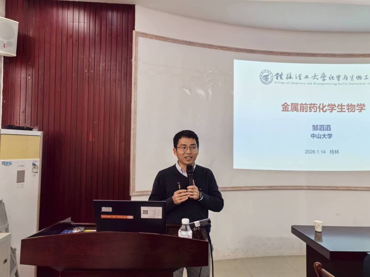 雁山校区萃华楼217室作题为《金属前药化学生物学》的学术报告。报告会由梁福沛教授主持,近百名师生现场参加。