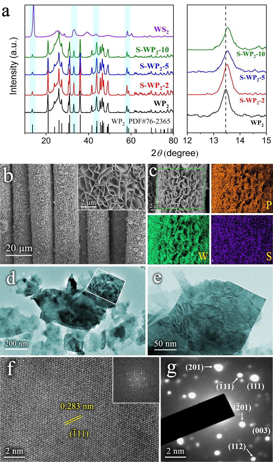 X射线衍射(XRD)图显示了S-WP2的特征峰与单斜WP2匹配(PDF#76-2365),与原始WP2相比。S-WP2在约13.5°的峰值处略微正移,扫描电镜图(SEM)展示了厚度均匀的纳米薄片,垂直交错生长的方式使得催化剂具有大比表面积。X射线能谱(EDS)分析证明了催化剂材料中存在均匀分布的W、P和S元素。透射电镜(TEM)和选区电子衍射(SAED)图像表明催化剂与WP2的多个晶面相匹配。综上表征显示,成功制备了S-WP2阴极析氢电催化剂。