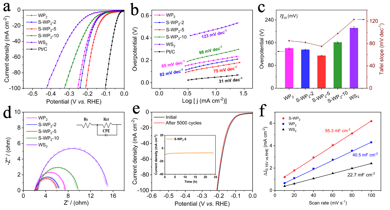 电化学性能测试结果表明,S元素的掺杂有效的提高了WP2的电催化析氢性能。在酸性电解液中测试了催化剂的电催化性能,S-WP2在-10 mA cm-2电流密度下时仅需-115 mV (vs. RHE),Tafel斜率为75 mV dec-1,同时拥有小的电荷转移电阻(Rct = 3.8 Ω)以及超过24 h的长时间稳定性。