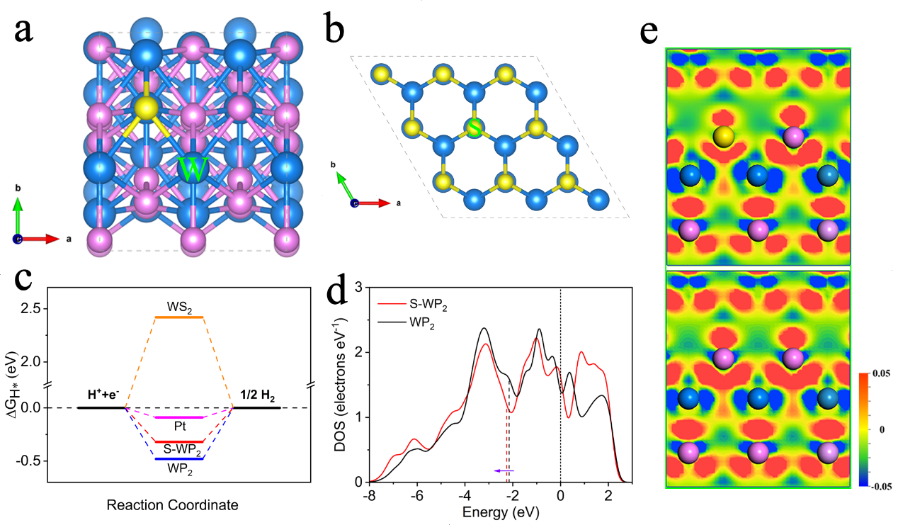 通过密度泛函理论(DFT)计算,进一步揭示了硫掺杂对WP2电子结构和催化性能的影响。W原子在S-WP2表面顶位的ΔGH*值约为-0.32 eV,比WP2(-0.48 eV)更接近于零,这表明S-WP2对电催化析氢反应更有利。d轨道偏态密度谱也表明S-WP2的d带中心距离费米能级比WP2更远,这意味着它更有利于电催化析氢反应。电荷密度分图显示电子从W原子转移到P和S原子。结果表明,适量的S掺杂可以有效地调节其表面电子结构,从而提高其性能。