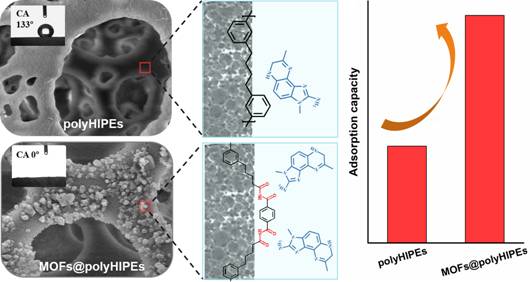 复杂样品基质中痕量物质的高效分离富集在样品前处理领域具有挑战性。目前关于MOFs@polyHIPEs复合物的研究主要集中在解决polyHIPEs的不稳定性,所得复合物的力学性能差,低的MOFs负载和孔隙堵塞等问题上。然而通过控制MOFs的比例来调节MOFs@polyHIPEs的表面润湿性尚未见报道。阮贵华研究员课题组研究中通过对MOFs材料的表面改性修饰并调整负载量来直接调控多孔材料MOFs@polyHIPEs表面润湿性,从而提高吸附性能,并有效避免改性MOFs的分解,该研究成功应用于复杂食品样品中痕量杂环胺的分离富集与检测,为发展新型固相萃取材料提供了可行的思路与解决方案。
