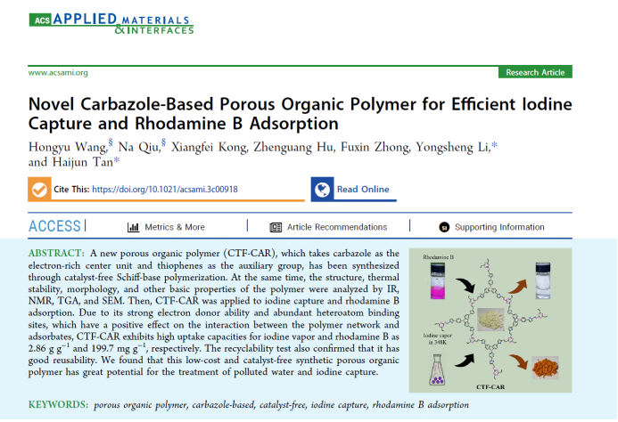 导航痕迹 当前位置: 快看漫画 >> 科学研究 >> 学术动态 >> 正文 快看漫画 谭海军副教授课题组在多孔有机聚合物开发及其环境应用领域取得重要研究进展 作者:谭海军 发布日期:2023-03-09 浏览次数: 近日,快看漫画 谭海军副教授课题组开发了一种基于咔唑的新型多孔有机聚合物材料CTF-CAR,该材料具有良好的比表面积,内部富含N、S等杂原子。应用研究发现,CTF-CAR对印染污水中的有机染料尤其是罗丹明B有很好的快速响应吸附与去除作用,吸附量达到199.7 mg g−1;同时,发现该材料可用于放射性碘的吸附,碘蒸气与碘溶液的吸附量为:2.86 g g−1 和224.5 mg g−1。该研究成果以题为“Novel Carbazole-Based Porous Organic Polymer for Efficient Iodine Capture and Rhodamine B Adsorption ”被化学与材料类知名期刊ACS Applied Materials Interfaces(IF=10.38)录用并正式发表。该项研究得到国家自然科学基金、广西科技计划项目、广西电磁化学功能物质重点实验室主任基金等多个项目的资助,快看漫画 硕士研究生王鸿钰、邱娜为论文共同第一作者,快看漫画 为第一通讯单位,谭海军副教授为通讯作者。 全文链接://pubs.acs.org/doi/full/10.1021/acsami.3c00918 上一条:快看漫画 海杰峰副教授在国际权威期刊Chemical Engineering Journal上发表绿色高效有机太阳能电池研究成果 下一条:国际顶级期刊《Advanced Functional Materials》报道快看漫画 海杰峰副教授课题组在有机太阳能电池方面研究进展