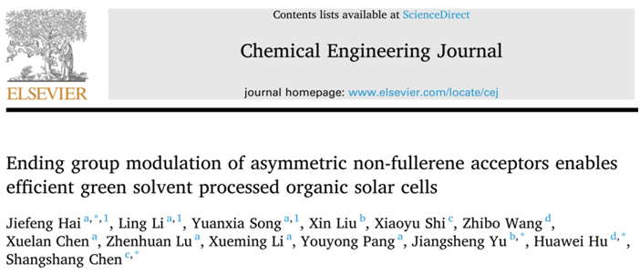 海杰峰副教授联合南京理工大学俞江升副研究员、东华大学胡华伟研究员和南京大学陈尚尚教授在绿色高效有机太阳能电池研究方面取得最新成果,在知名期刊Chemical Engineering Journal(SCI一区TOP期刊,IF=16.744)上发表题为“Ending group modulation of asymmetric non-fullerene acceptors enables efficient green solvent processed organic solar cells”的研究论文。该项研究工作得到广西自然科学基金(2022JJA120094)、广西电磁化学功能物质重点实验室开放基金(EMFM2022101)和广西高校中青年教师科研基础能力提升项目(2022KY0256)等多个项目的资助。