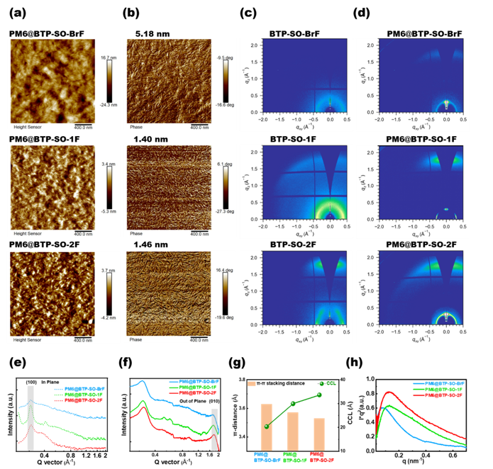 Figure 3. AFM (a) height and (b) phase images (2 μm × 2 μm) of the blend films based on PM6:BTP-SO-BrF, PM6:BTP-SO-1F, and PM6:BTP-SO-2F. 2D GIWAXS patterns of (c) three neat NFA films and (d) three blend films. The corresponding 1D GIWAXS line-cut profiles of the (e) in-plane (in dashed) and (f) out-of-plane (in solid) directions of three blend films. (g) π-π stacking distance and CCL out-of-plane π-π peak of three blend films. (h) Lorentz-corrected RSoXS profiles of three blend films.