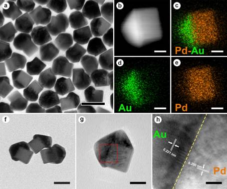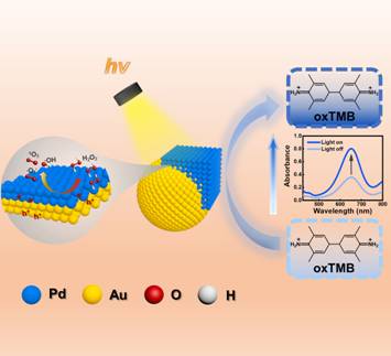 袁亚利教授研究团队以具有明确异质界面的Pd-Au异质纳米颗粒(Pd-Au dimers)为模型体系,研究了等离激元效应在可见光照射下对纳米酶活性的影响。通过实验研究在可见光(515-700 nm、44.5 mW/cm2)光照下,基于Pd-Au dimers的LSPR效应,其催化活性增强,紫外吸光度相较于无光照时增加了0.45,并与Pd纳米立方体与Au纳米粒子相比,Pd-Au dimers催化活性的增强幅度最大。同时,对催化机理进行研究,结果表明了当光被Pd-Au dimers吸收时,产生的电子-空穴对比局域热效应起了更为重要的作用,即热电子从Au转移到Pd后,进一步提高了该材料的催化效率。研究中还发现了纳米酶中的等离激元效应可以有效地驱动H2O2的分解反应,产生了更丰富的ROS中间体(·OH、·O2-和1O2)。最后,将具有过氧化物活性的Pd-Au dimers应用于比色分析,成功建立了基于等离激元效应增强检测ALP的比色方法。