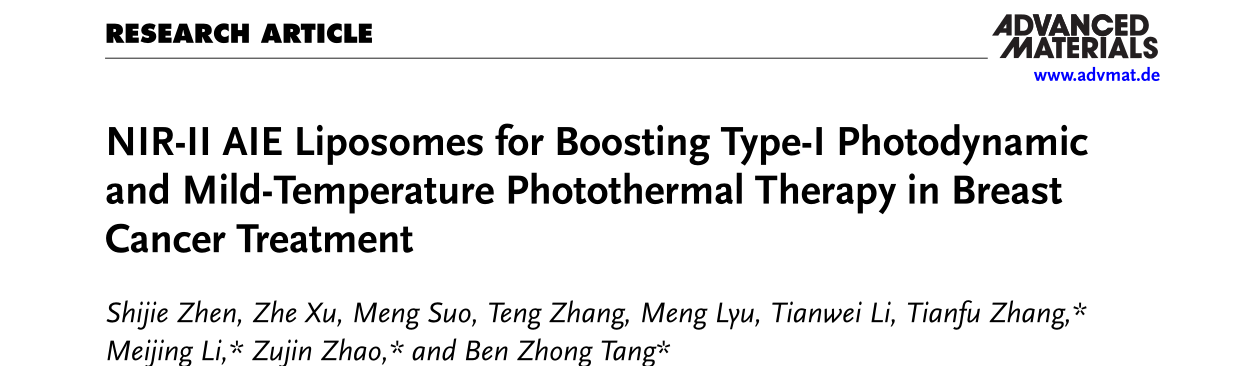 甄士杰老师/李美静博士联合广州医科大学张天富副教授、华南理工大学赵祖金教授和香港中文大学(深圳)唐本忠院士在顶级期刊Advanced Materials上发表题为《NIR-II AIE Liposomes for Boosting Type-I Photodynamic and Mild-Temperature Photothermal Therapy in Breast Cancer Treatment》(10.1002/adma.202411133)的研究论文。论文第一作者是快看漫画