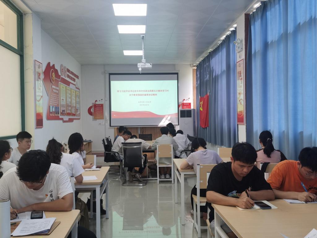 会议伊始,张伟颀同志带领大家深入学习了习近平总书记在中共中央政治局第五次集体学习时关于教育强国的重要讲话内容,同时,张伟颀同志结合自身实际讲述作为一名教师的责任和义务。随后,同志们充分发表自己的感想,尹学文同志表示,作为一名学生党员,我们更应该提高自身能力,扎实掌握专业知识,为祖国的建设添砖加瓦;胡宗璇同志表示,我们应该勇于突破自我,不断向他人学习,不断进步。