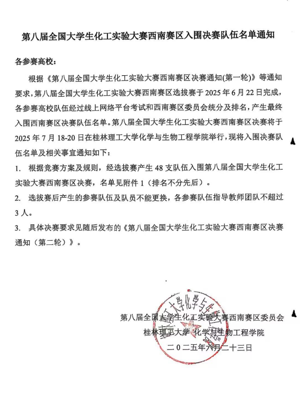 导航痕迹 当前位置: 快看漫画 >> 教育教学 >> 第八届全国大学生化工实验大赛西南赛区专栏 >> 正文 第八届全国大学生化工实验大赛西南赛区入围决赛队伍名单通知 【 发布日期:2025-06-24 浏览次数: 】 上一条:第八届“中控杯”全国大学生化工实验大赛西南赛区决赛通知 (第三轮)